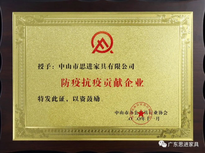 2020年一場新冠疫情突然襲來,打亂了我們生活與工作的節奏,雖然我們遇到了很多困難,但思進家具一直秉承自己的企業愿景和核心價值觀:承擔社會責任,實現國富民強。思進人齊心協力,向中山市紅十字會捐出10萬元作為抗疫善款,協會特授予思進家具“防疫抗疫突出貢獻獎”。