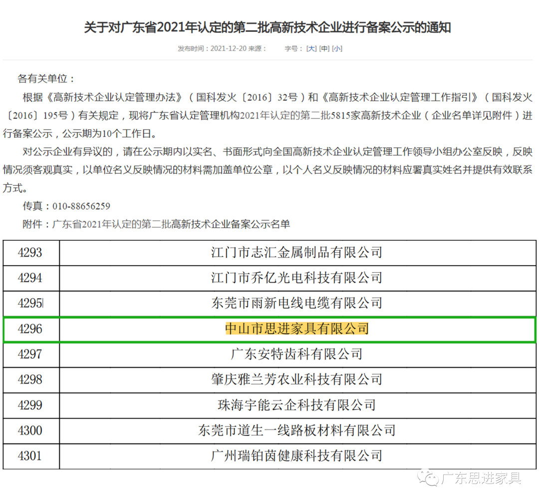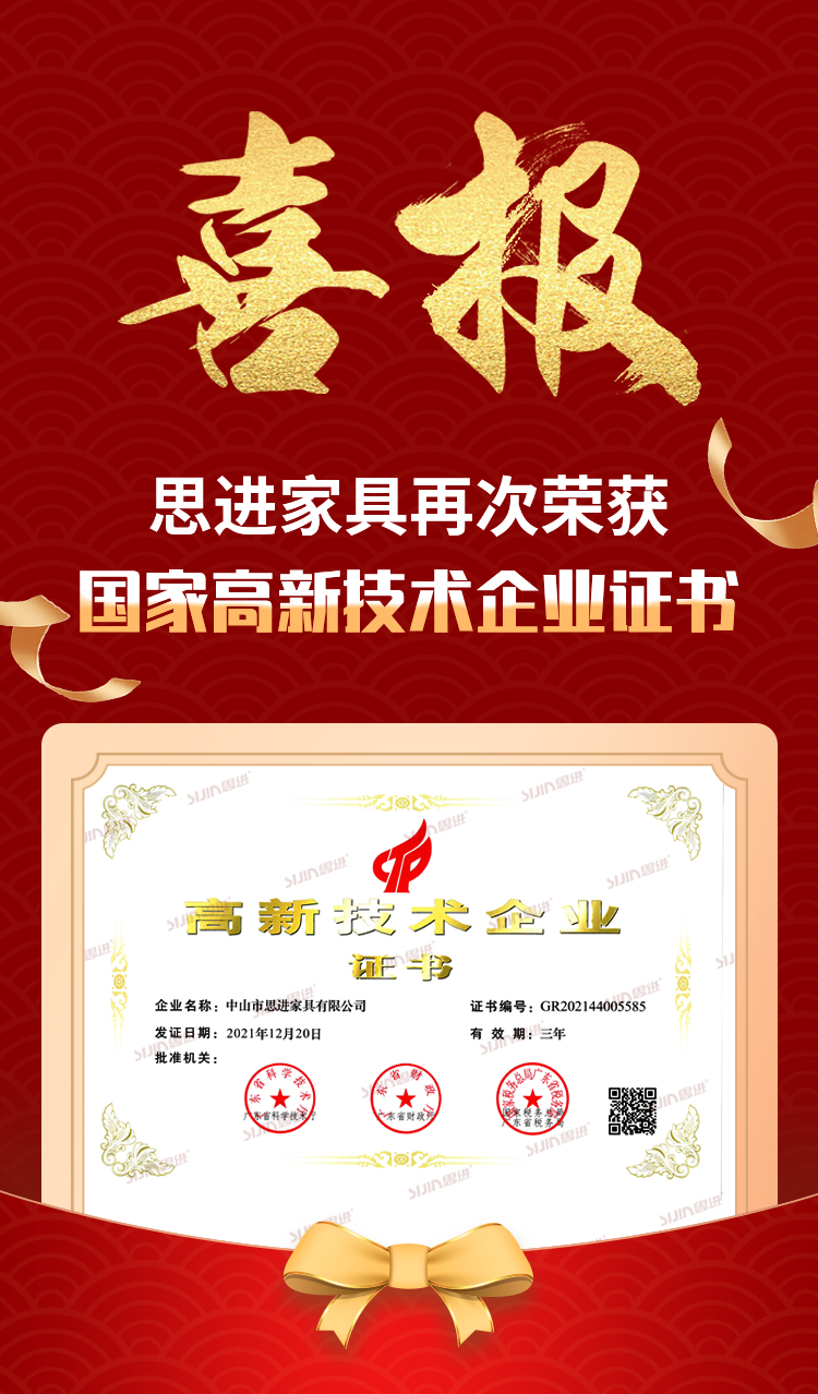 經(jīng)廣東省科學(xué)技術(shù)廳、廣東省財政廳 、國家稅務(wù)總局廣東省稅務(wù)局等有關(guān)部門的嚴(yán)格評審。中山市思進(jìn)家具有限公司順利通過高新企業(yè)認(rèn)證。繼2016年思進(jìn)家具獲得高新技術(shù)企業(yè)認(rèn)定以來,2021年復(fù)評再獲高企認(rèn)定(2022年發(fā)證),充分體現(xiàn)了思進(jìn)家具經(jīng)營管理水平及科技創(chuàng)新能力。