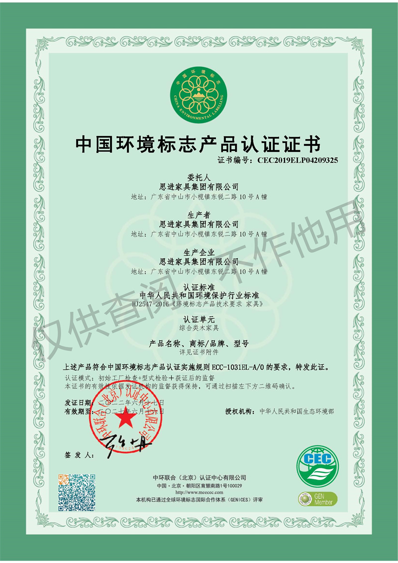 家具產品環保衛士認證證書-金屬家具