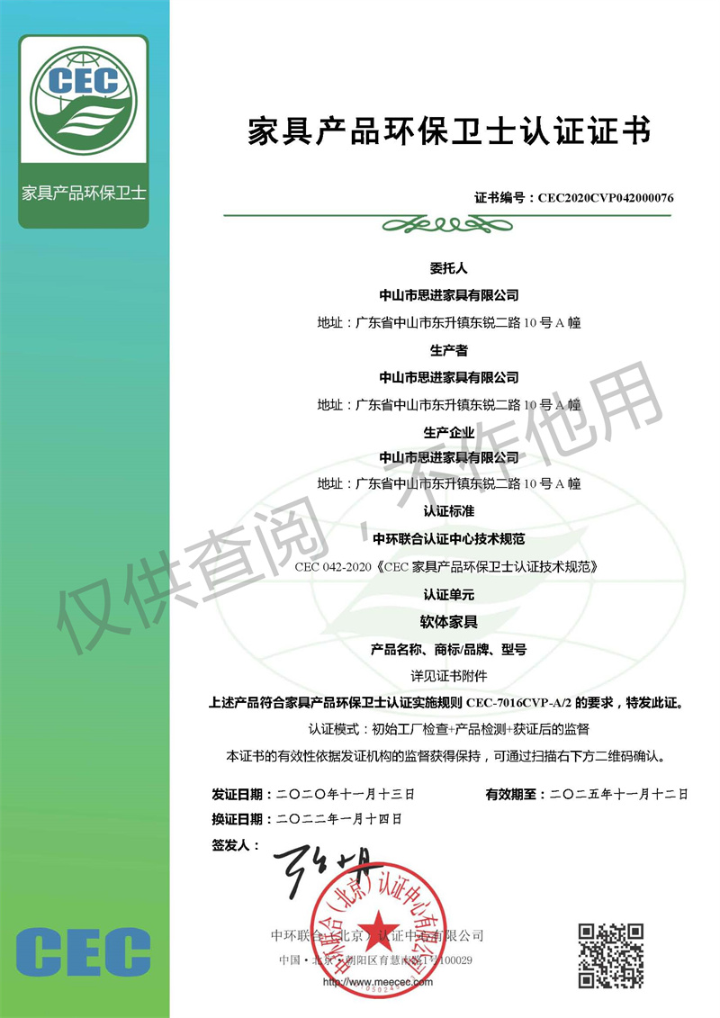 家具產品環保衛士認證證書-軟體家具